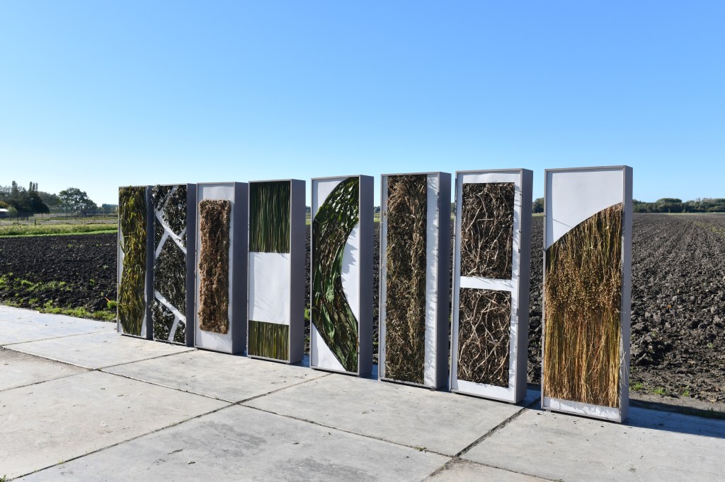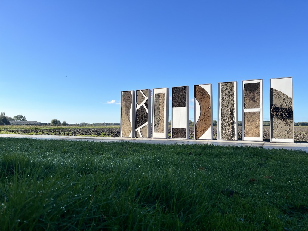 Afgelopen periode heb ik de 8 deelgebieden en verschillende experimenten en project bezocht. Uit elke regio heb ik de grondsoorten en andere materialen verzameld. De 8 panelen waaruit het kunstwerk bestaat refereren aan de 8 deelgebieden van de regio deal: Schiermonnikoog, Noordelijke kleischil, Oldambt, Veenkoloniën, Westerwolde, Friese kleiweide, Friese Veenweide en het Drents plateau. Aan beide zijden zijn de materialen en grondsoorten terug te vinden.